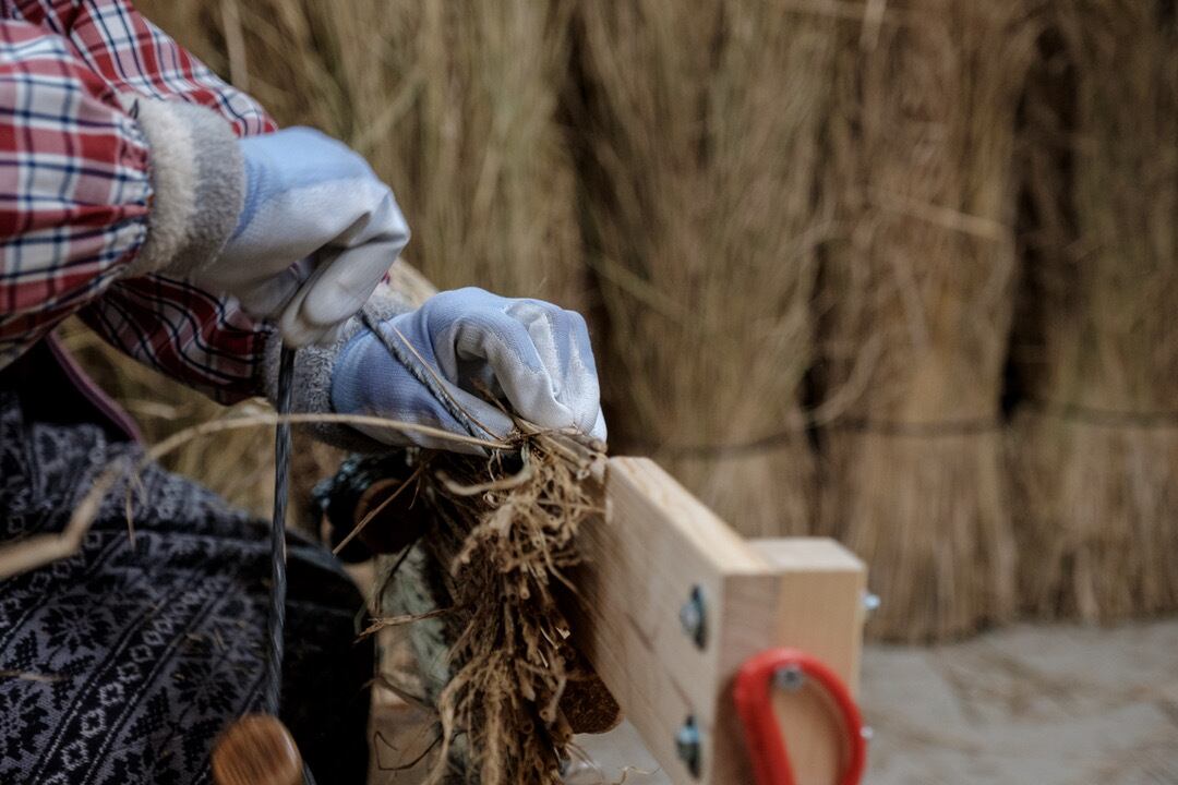 こもは、お米の藁(わら)を一つ一つ手作業で編んで、